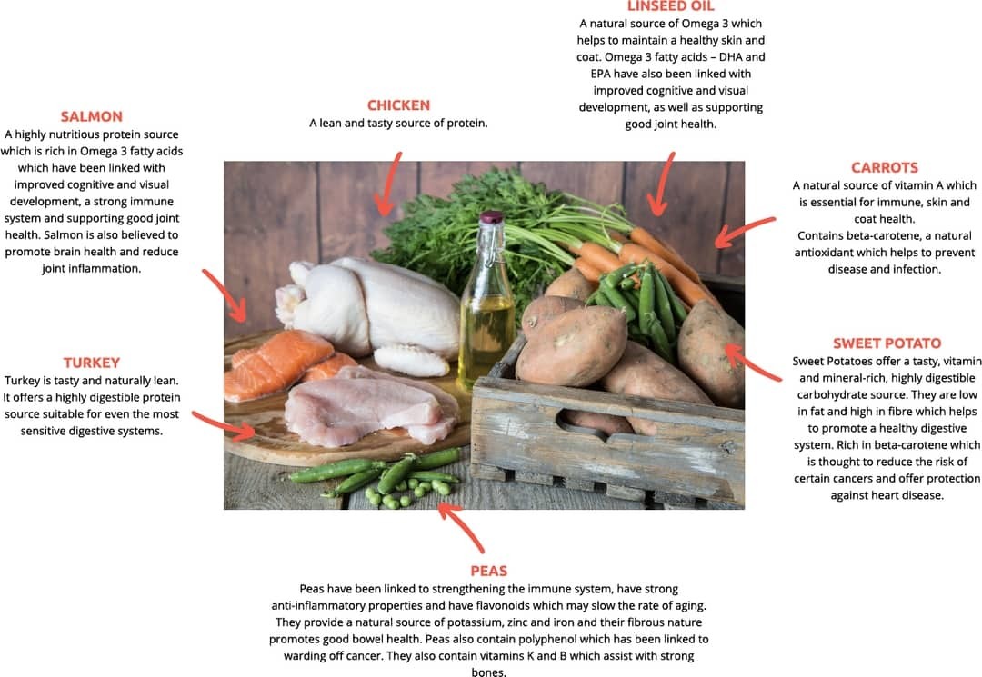 Chicken, Turkey & Salmon 60% (including 20% Freshly Prepared Chicken, 14% Dried Chicken, 7% Freshly Prepared Turkey, 7% Freshly Prepared Salmon, 7% Dried Turkey, 3% Dried Salmon and 2% Chicken Stock);