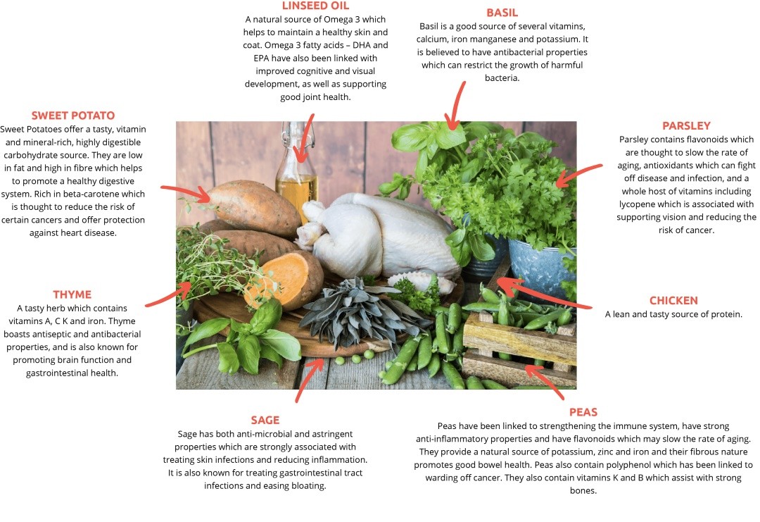 Chicken offers a lean and tasty source of protein which is highly digestible, even for dogs with the most sensitive digestive systems. The sweet potato offers a tasty and highly digestible complex carbohydrate which is high in B vitamins. Sugar beet offers a natural source of dietary fibre promoting good intestinal transit time. Added pre-biotics support the growth of healthy gut bacteria. Linseed oil offers an excellent source of omega 3 maintaining healthy skin and coat. We add a carefully selected variety of vitamins and minerals to make this food a complete diet.