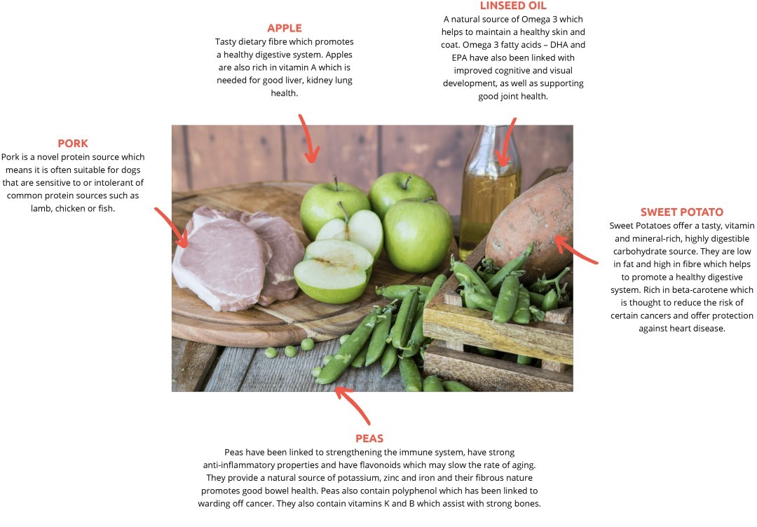 Pork is rich in vitamins and minerals and is a particularly tasty source of protein.The sweet potato offers a tasty and highly digestible complex carbohydrate which is high in B vitamins. Sugar beet offers a natural source of dietary fibre promoting good intestinal transit time. Added pre-biotics support the growth of healthy gut bacteria. Linseed and salmon oils offer an excellent source of omega 3 maintaining healthy skin and coat, and supporting visual development and cognitive function. We add a carefully selected variety of vitamins and minerals to make this food a complete diet. We never add any artificial colours or preservatives. This food is naturally preserved with rosemary extract and tocopherols.