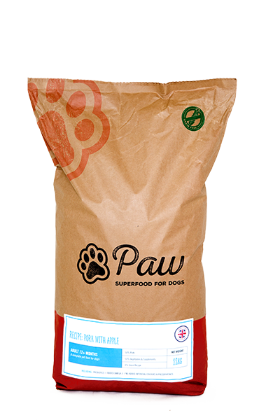 Our pork with apple recipe has a single protein source and is formulated without dairy, soya, beef, eggs or grains, including wheat and wheat gluten. This makes it particularly suitable for dogs with specific intolerances or sensitivities. Pork is rich in vitamins and minerals and is a particularly tasty source of protein. Linseed and salmon oils offer an excellent source of omega 3 maintaining healthy skin and coat, and supporting visual development and cognitive function. We add a carefully selected variety of vitamins and minerals to make this food a complete diet.