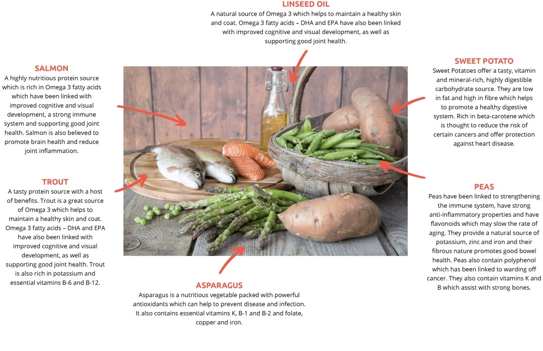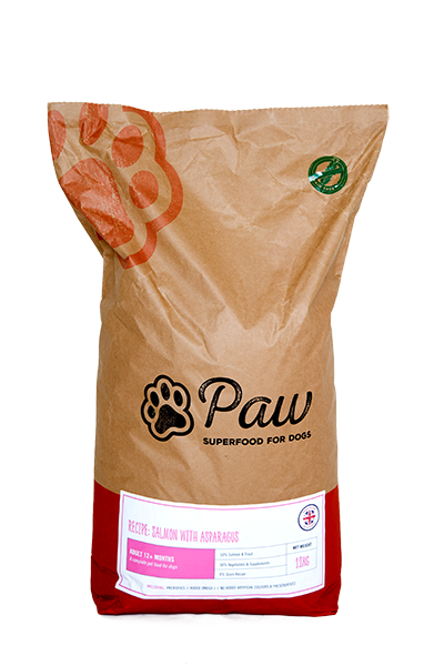 Our salmon with asparagus recipe is formulated without dairy, soya, beef, eggs or grains, including wheat and wheat gluten. This makes it particularly suitable for dogs with specific intolerances or sensitivities. Salmon is a very nutritious protein, rich in Omega 3 fatty acids which have been linked with improved cognitive and visual development, a strong immune system and supporting good joint health.